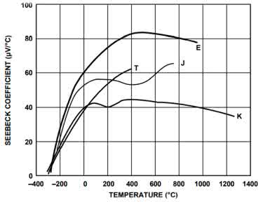 - Front-endy AD849x nie są wyposażone w żadną funkcję kompensacji nieliniowości termopary – dokładność pomiarową (w określonych w dokumentacji zakresach temperatur) osiągnięto jedynie poprzez odpowiednie manipulowanie wzmocnieniem i offsetem wzmacniacza oraz czułością wbudowanego czujnika temperatury, stosowanego do kompensacji zimnego końca. Dość nietypowe zakresy pracy poszczególnych modeli AFE z omawianej rodziny są zatem wynikiem przebiegu krzywych charakterystyki współczynnika Seebecka dla danych typów termopar (rysunek 4) oraz arbitralnego przyjęcia przez producenta maksymalnej wartości dopuszczalnego błędu (2°C).