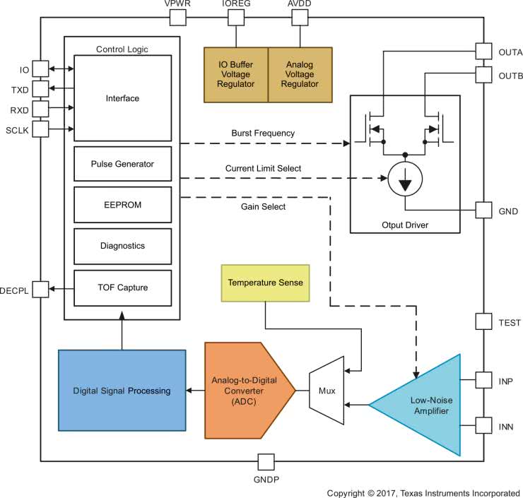 Wszystkie opisane powyżej cechy ma układ PGA460 oraz jego wersja przeznaczona dla branży automotive i z kwalifikacją AEC-Q100 – PGA460-Q1. Ogólny schemat blokowy układu pokazano na rysunku 1.