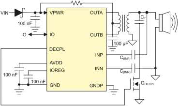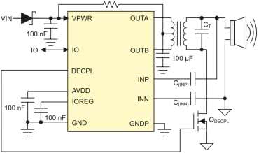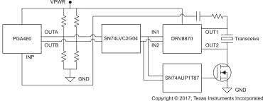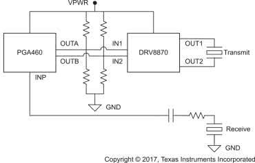 Twórcy front-endu PGA460 przewidzieli dwie funkcje, umożliwiające sterowane elektronicznie odsprzęganie uzwojenia wtórnego transformatora dopasowującego bądź dodatkowego kondensatora, włączonego równolegle do przetwornika. W pierwszym przypadku (pokazanym na rysunku 16) jedno z wyprowadzeń uzwojenia wtórnego należy podłączyć przez zewnętrzny tranzystor MOSFET-N do masy. Bramka tranzystora jest sterowana bezpośrednio przez wyjście DECPL, co umożliwia chwilowe odpięcie transformatora od masy w celu redukcji obciążenia elementu piezoelektryczngo przetwornika – celem operacji ma być zwiększenie jego czułości w fazie odbioru echa (natomiast podczas nadawania tranzystor ten jest włączany, co pozwala na odpowiednie wysterowanie przetwornika).