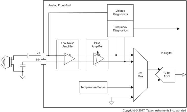 Na rysunku 9 zaprezentowano schemat blokowy toru odbiorczego front-endu PGA460. Pozornie układ ten jest dość prosty, ale ilustracja zdecydowanie nie oddaje rzeczywistych możliwości opisywanego AFE – kaskadowo połączone wzmacniacze: niskoszumowy (LNA) o stałym wzmocnieniu oraz programowalny (PGA) są skierowane do multipleksera, do którego podłączono też wbudowany czujnik temperatury, zaś wyjście multipleksera prowadzi bezpośrednio do przetwornika ADC. W torze głównym (za PGA) włączony jest blok diagnostyczny sprawdzający częstotliwość sygnału, zaś na samym początku układu (bezpośrednio do wejścia INP) wpięto blok testujący napięcie przetwornika.