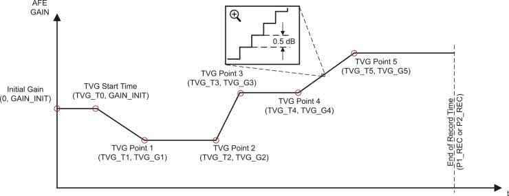 Prawdziwa siła front-endu jest ukryta w jego możliwościach konfiguracyjnych. Konstruktorzy układu zdecydowali się na zastosowanie bardzo interesujących rozwiązań mających na celu maksymalne rozszerzenie zakresu dynamiki pomiarów przy użyciu przetwornika ADC o – nie da się ukryć – niezbyt zawrotnej rozdzielczości bitowej. Wzmacniacz PGA może być ustawiany w zakresie od 32 dB do 90 dB, ale inaczej niż w przypadku zdecydowanej większości front-endów. Najczęściej bowiem regulacja wzmocnienia odbywa się w sposób statyczny – raz ustawiony wzmacniacz utrzymuje dany poziom wzmocnienia aż do resetu lub kolejnej zmiany zawartości rejestru konfiguracyjnego. W przypadku PGA460 do dyspozycji użytkownika jest aż 8 (!) rejestrów, umożliwiających zdefiniowanie 6-punktowego profilu wzmocnienia, zmiennego w czasie i określonego za pomocą par (TVG_Tx, TVG_Gx), gdzie: TVG_Tx – x-ty punkt czasowy, w którym rozpoczyna się zmiana (wzrost lub spadek wzmocnienia), TVG_Gx – x-ta wartość wzmocnienia w odpowiadającym punkcie czasowym. Wszystkie te pola bitowe znajdują się w rejestrach TVGAIN0...6, zaś dodatkowy, ósmy rejestr GAIN_INIT ustala wstępny poziom wzmocnienia, stosowany jeszcze przed punktem (TVG_T0, TVG_G0). Takie rozwiązanie może wydawać się dość skomplikowane, dlatego – w myśl przysłowia mówiącego, że jeden obraz wyraża więcej niż tysiąc słów – na rysunku 10 prezentujemy przykładowy profil wzmocnienia zaprogramowany za pomocą opisanych rejestrów.
