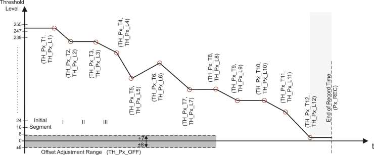 Co ciekawe, dość podobne rozwiązanie zastosował producent w zakresie… progu detekcji sygnału echa. W tym przypadku ustawienia są zapisywane w bloku rejestrów o imponującym rozmiarze aż 32 bajtów, w sposób zbliżony do mapy punktów profilu wzmocnienia (dla każdego punktu ustawiany jest zarówno czas, jak i wartość progu). Warto dodać, że tylko pierwszy segment ma czas określony arbitralnie (tj. od początku fazy odbiorczej) – pozostałe, nazwane mianem delta time, odpowiadają za różnicę czasu pomiędzy danym punktem a poprzednim (rysunek 11). Dla każdego z dwóch presetów użytkownik może określić 12-punktową mapę, przy czym wszystkie odcinki czasowe należą do przedziału od 100 μs do 8000 μs. Dla całego bloku przewidziano nawet dedykowany rejestr sumy kontrolnej, pozwalający na całościowe sprawdzenie poprawności zapisu danych. Przestrajanie progu detekcji wykorzystywanego przez cyfrowy komparator ma oczywiście na celu sukcesywne zwiększanie czułości wraz ze spodziewanym spadkiem amplitudy echa – im dalej położony obiekt, tym później pojawia się pochodzący od niego sygnał i jednocześnie słabszy jest jego poziom.