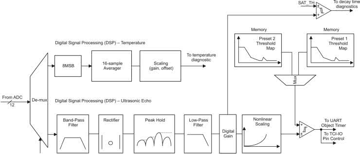 Detekcja echa odbywa się już w domenie cyfrowej, zatem nasz komparator (przestrajany programowalną mapą) musi znajdować się w bloku DSP, którego schemat funkcjonalny pokazano na rysunku 12. Dane z przetwornika ADC trafiają najpierw do demultipleksera, który rozdziela próbki na dwa sygnały: echa oraz pomiarów temperatury. Ten pierwszy trafia najpierw na filtr pasmowoprzepustowy, pracujący w roli dyskryminatora przepuszczającego jedynie sygnał w wąskim paśmie wokół częstotliwości nadawania – rzecz jasna, filtr jest ustawiany zależnie od zawartości rejestru FREQ, zaś dodatkowo użytkownik ma możliwość zaprogramowania szerokości pasma w zakresie od 2 do 8 kHz (z krokiem co 2 kHz). Należy jednak pamiętać, że automatyczne obliczenie współczynników filtra BPF (Butterworth o nieskończonej odpowiedzi impulsowej) następuje jedynie dla dolnego zakresu częstotliwości (30...80 kHz) – w przypadku ustawienia bitu FREQ_SHIFT rejestry współczynników muszą zostać zaprogramowane przez układ nadrzędny (MCU) za pomocą łącza U(S)ART.