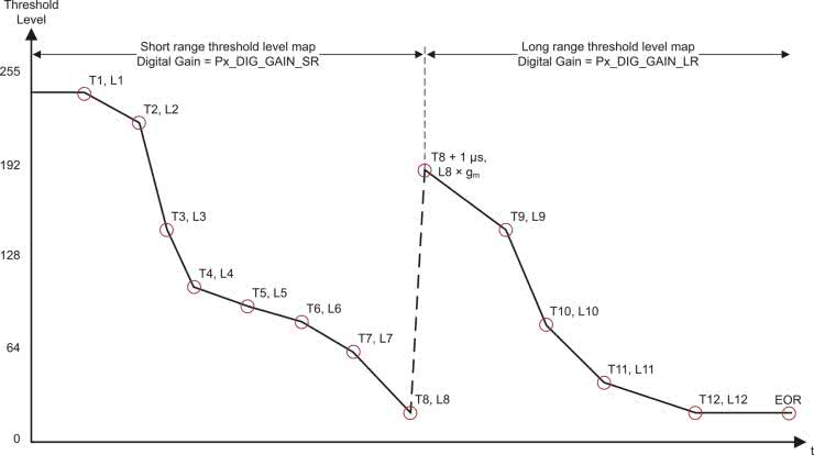 W podobnym celu, choć znacznie prościej, producent zrealizował także funkcję wzmocnienia cyfrowego, której działanie pokazano na rysunku 13. Do dyspozycji użytkownika są (osobne dla obu presetów) pola bitowe, pozwalające na ustawienie wzmocnienia dla echa w polu bliskim i dalekim, a także punktu czasowego (TH9...TH12), w którym ma nastąpić przełączenie wzmocnienia. Aby uniknąć „fałszywego alarmu”, czyli niewłaściwego zadziałania detektora echa w wyniku nagłego wzrostu wartości sygnału po zmianie wzmocnienia, front-end automatycznie przemnaża próbki sygnału pomiarowego zgodnie z ustawieniem progu dla danego obszaru pola (bliskie/dalekie). Dzięki temu zabiegowi amplituda słabego echa odległych obiektów może być dodatkowo zwiększona na drodze prostej operacji cyfrowej, zaaplikowanej jednak dopiero po etapie demodulacji i filtracji dolnoprzepustowej – czyli już po usunięciu większości szumów z różnych źródeł.