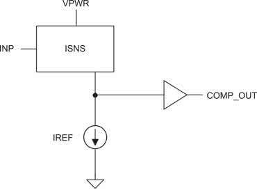 - Diagnostyka napięcia pobudzającego przetwornik – impulsy pobudzające przetwornik w fazie nadawczej trafiają także na wejście INP, co powoduje przepływ przezeń niewielkiego prądu. Ten zaś porównywany jest przez wbudowany komparator z wewnętrznym źródłem prądowym (rysunek 14) – jeżeli sygnał na linii INP ma zbyt małą amplitudę (lub przeciwnie – utrzymuje się na wysokim poziomie nawet poza fazą nadawania), zgłoszony zostaje błąd, który można następnie odczytać przez jeden z interfejsów komunikacyjnych.