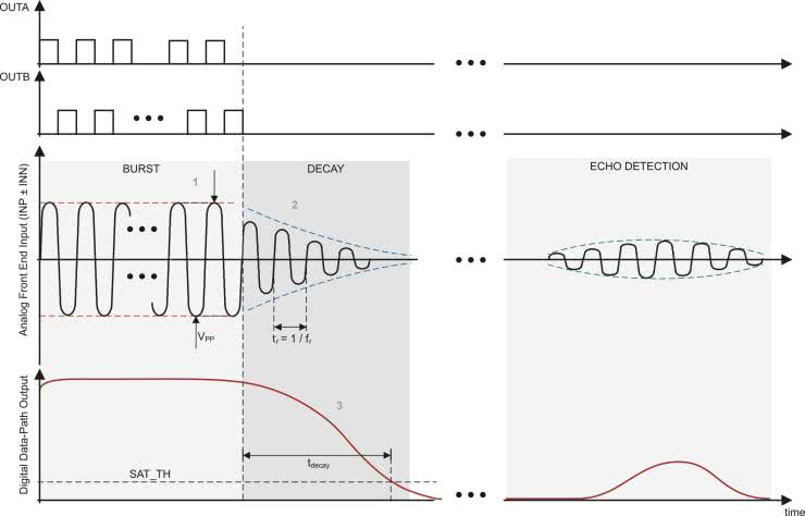 - Pomiar czasu zaniku drgań – na podstawie zdemodulowanego sygnału z przetwornika front-end PGA460 jest w stanie określić czas zaniku drgań rezonansowych, odmierzając (z 16-mikrosekundową rozdzielczością) czas upływający od zakończenia nadawania do spadku sygnału poniżej progu zaprogramowanego poprzez parametr SAT_TH. Wraz z pomiarem częstotliwości funkcja ta może być zastosowana do detekcji mechanicznej blokady membrany przetwornika, wywołanej np. przez zgromadzone na niej zanieczyszczenia.