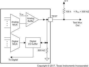 Obecny w układzie pin testowy umożliwia wyprowadzenie na zewnątrz front-endu użytecznych sygnałów diagnostycznych, obsługiwanych przez dedykowane multipleksery i bufory (rysunek 18).