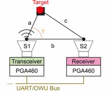 Interesujące propozycje rozbudowy urządzenia bazującego na front-endzie PGA460 zaprezentował producent w nocie aplikacyjnej SLAA783 pt. PGA460 Array of Ultrasonic Transducers for Triangulation and Tracking. Zastosowanie dwóch transceiverów ultradźwiękowych bądź jednego transceivera i jednego układu odbiorczego (bez możliwości nadawania) pozwala na zbudowanie systemu zdolnego do obliczania pozycji obiektu metodą triangulacji. Przykład takiej realizacji pokazano schematycznie na rysunku 19.