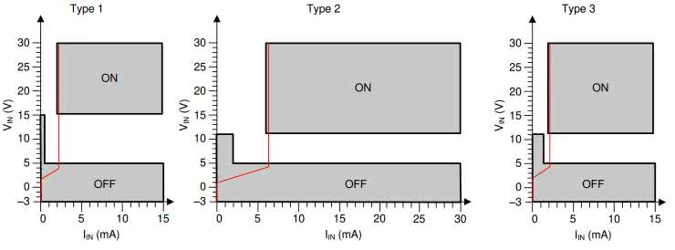 - Typ 3 - odpowiednie dla energooszczędnych sensorów półprzewodnikowych; ograniczają prąd w stopniu znacznie większym niż wejścia typu 2 (nawet dla stosunkowo wysokich napięć), dzięki czemu dobrze nadają się do wielowejściowych modułów PLC.