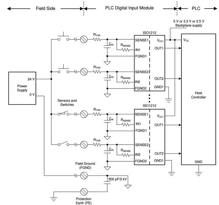 Front-end spełnia wymogi normy 61131-2 w zakresie parametrów wejść typu 1, 2 oraz 3, a jakby tego było mało - jest w stanie pracować z przepustowością aż do 4 Mbps, dzięki czemu nadaje się nawet do najbardziej wymagających konstrukcji sterowników PLC. Wersja ISO1212, produkowana w 16-pinowej obudowie SSOP, ma natomiast dwa rozdzielone (za pomocą izolacji funkcjonalnej) tory pierwotne oraz wspólną część wtórną (wyjściową), odseparowaną przez sprzężenie pojemnościowe od strony wejściowej. Podstawowy schemat aplikacyjny stopnia wejściowego sterownika PLC, opartego na układach ISO1212, pokazano na rysunku 6.