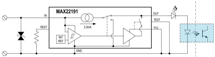 Wbudowane źródło prądowe zapewnia kompatybilność z parametrami normy 61131-2 dla wejść typu 1 i 3. MAX22191 ma także funkcję testu, umożliwiającą sprawdzenie poprawności działania obwodów wyjściowych, sterujących np. transoptorem oraz - połączoną szeregowo z jego nadajnikiem - diodą sygnalizacyjną LED. W tym celu użytkownik musi - w czasie, gdy na linii IN panuje napięcie przewyższające próg przełączania komparatora - podać stan wysoki na wejście TEST, co spowoduje zmianę stanu na wyjściu układu z wysokiego na niski. Linia REXT służy do podłączenia 1-procentowego rezystora referencyjnego o wartości 40,2 kΩ.