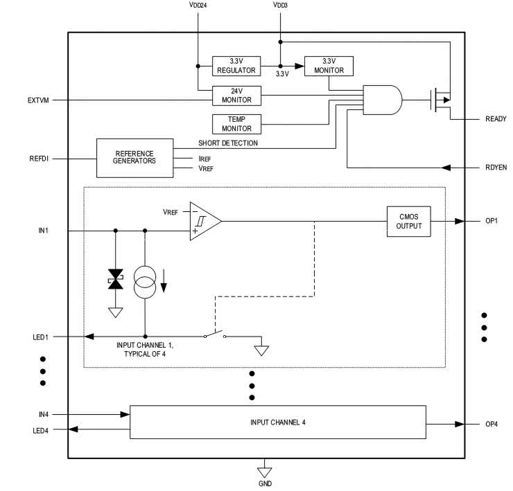 Układ MAX22193 (rysunek 8) jest już zdecydowanie bardziej rozbudowany i to nie tylko ze względu na obecność czterech kanałów wejściowych. W strukturze front-endu znalazł się bowiem obszerny układ autodiagnostyki, monitorujący napięcie zasilające (24 V), wyjście wbudowanego stabilizatora liniowego (3,3 V), temperaturę struktury półprzewodnikowej oraz zwarcie linii REFDI (połączonej z blokiem generatora prądów i napięć odniesienia) do masy układu. Ponadto producent postanowił udostępnić użytkownikom dodatkową linię wejściową (RDYEN), która przy obecności poprawnych sygnałów testowych z wymienionych wyżej bloków monitorujących umożliwia podniesienie stanu logicznego na wyjściu READY, sygnalizującym sterownikowi nadrzędnemu gotowość do pracy.