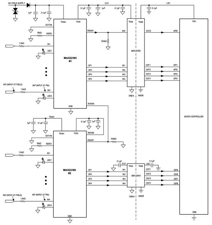 Każdy kanał wejściowy układu MAX22193 jest wyposażony nie tylko w linię wyjściową typu CMOS, ale także w osobne wyjście do sterowania diodą LED, sygnalizującą rzeczywisty stan wejścia i to w sposób całkowicie niezależny od działania nadrzędnego procesora (a zatem - nieangażujący go do obsługi wskaźników LED). Rozwiązanie to jest więc bardzo zbliżone do tego, które znamy już z układów MAX22191, z tą jednak różnicą, że front-endy MAX22193 zostały zoptymalizowane do pracy nie z osobnymi transoptorami dla poszczególnych kanałów, ale z cyfrowymi, wielotorowymi izolatorami, np. MAX22166 - schemat przykładowej aplikacji tego typu, obejmującej 8 wejść, pokazano na rysunku 9. Należy tutaj podkreślić, że pomiędzy poszczególnymi wejściami nie ma rzecz jasna żadnej izolacji - są one odseparowane tylko od części procesorowej, ale po stronie pierwotnej pracują na wspólnej masie. Warto też dodać, iż obecność dwóch osobnych linii do obsługi sygnałów gotowości (READY oraz RDYEN) umożliwia łączenie kolejnych bloków w konfiguracji typu daisy-chain, co można zaobserwować na rysunku 9.