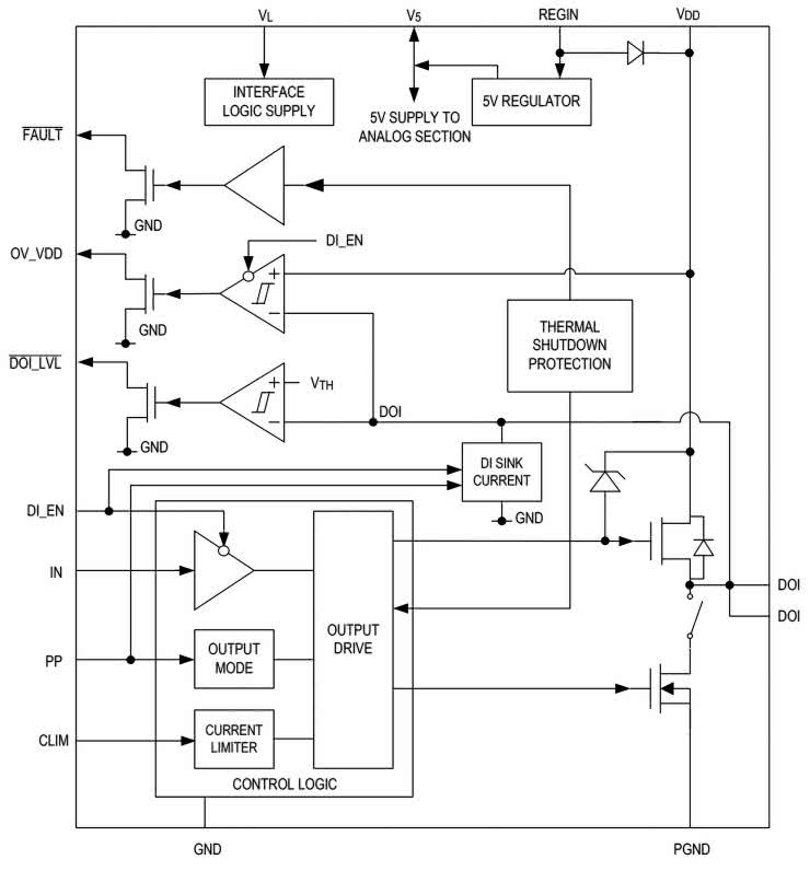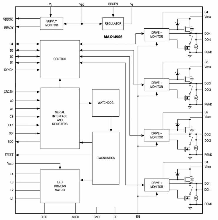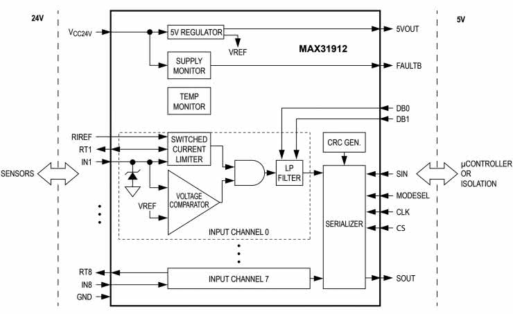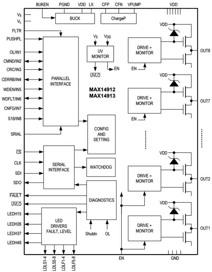 Kolejnym, wartym uwagi układem z oferty dawnej firmy Maxim, jest MAX14912, którego schemat blokowy można zobaczyć na rysunku 15.