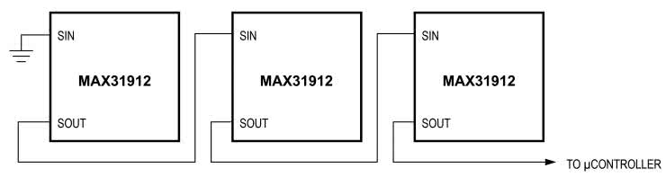 Nieco zbliżone rozwiązania konstrukcyjne zastosowali inżynierowie firmy Maxim w układzie MAX31912 (rysunek 10). Co ważne, w tym przypadku zamiast wyjścia równoległego, w którym każda linia cyfrowa odpowiadałaby swojemu stopniowi wejściowemu (jak miało to miejsce np. w MAX22193), układ MAX31912 oferuje blok serializacji, umożliwiający odczyt stanów wejść za pośrednictwem SPI, co znakomicie zmniejsza ilość miejsca na płytce drukowanej, zajętego w konwencjonalnych topologiach przez zestaw osobnych transoptorów.