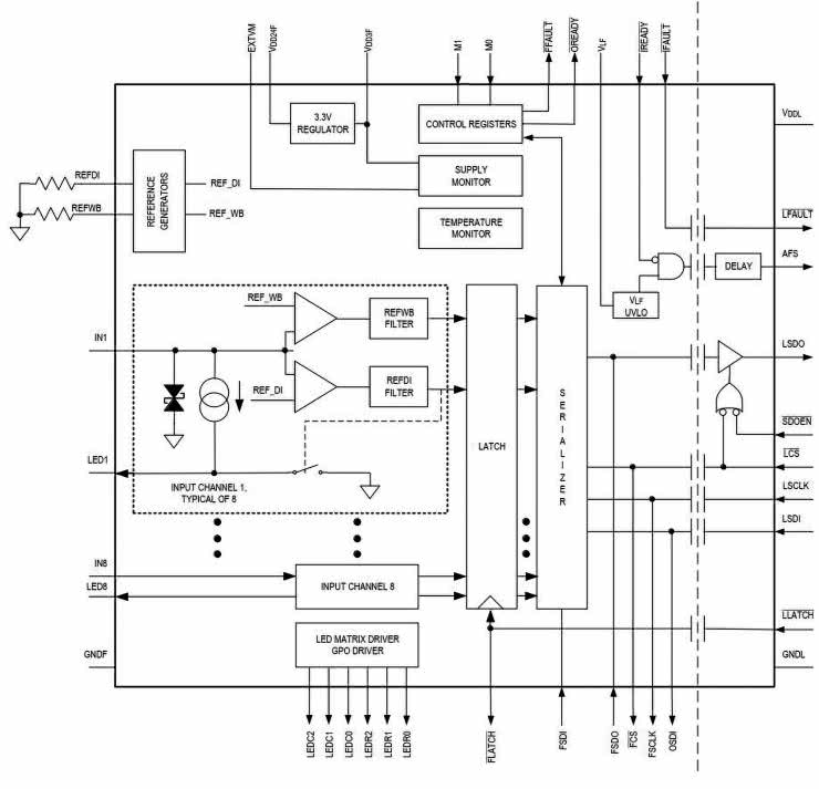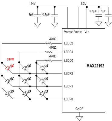 Co ciekawe, układ MAX22192 oferuje nie tylko osobne wyjścia do sterowania diodami LED, odpowiadającymi za optyczną sygnalizację stanów poszczególnych wejść. W strukturze front-endu znalazł się bowiem także blok sterownika multipleksowanej macierzy diod LED (podłączony do końcówek LEDC0...2 oraz LEDR0...2). Jedna z diod (włączona pomiędzy liniami LEDR0 oraz LEDC2) służy jako wskaźnik zasilania systemowego 24 V, zaś pozostałe mogą być wykorzystane do obrazowania błędów (przerw w obwodach) poszczególnych wejść bądź dowolnych innych stanów, przewidzianych przez projektanta.