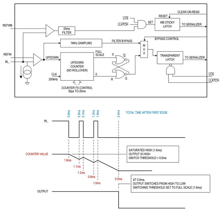 Nieco więcej uwagi warto poświęcić obwodom filtrów cyfrowych, znajdujących się w strukturze omawianego układu (rysunek 13). Sygnał z wyjścia głównego komparatora jest kierowany jednocześnie do 1-megahercowego układu próbkującego oraz do wejścia UP/DOWN licznika dwukierunkowego, "napędzanego" zegarem o częstotliwości 200 kHz. Wykrycie stanu wysokiego na wejściu INx powoduje inkrementację stanu licznika, zaś stan niski jest zliczany w dół (wartość licznika zmniejsza się o 1). Jeżeli zatem stabilny stan na wejściu utrzymuje się dostatecznie długo, układ uznaje, że należy zmienić stan linii wyjściowej, podawanej na układ serializacji. W przypadku gdy wykryto zbocze opadające, zmiana stanu wyjścia odbywa się przy osiągnięciu przez rejestr licznika wartości równej 0, zaś w przypadku zbocza narastającego - przełączenie wyjścia następuje przy wybranym przez użytkownika progu (odpowiadającym opóźnieniu rzędu od 50 μs do 20 ms). Co więcej, na wyjście szeregowe może być także podany sygnał bezpośrednio z 1-megahercowego układu próbkującego (tryb Filter bypass), co pozwala pracować z szybkimi (choć - co nie dziwi w przypadku aparatury przemysłowej - często mocno zaszumionymi) sygnałami rejestrowanymi przez wejście układu.