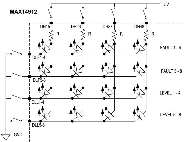 Tym razem mamy do czynienia z front-endem przeznaczonym do realizacji wyjść sterownika PLC - do dyspozycji konstruktora jest 8 kanałów, wyposażonych w stopnie wyjściowe o topologii push-pull i współpracujących z niezależnymi obwodami automatycznej diagnostyki. Układy wykorzystują opatentowaną przez Maxima technologię SafeDemag, mającą na celu bezpieczne "rozładowanie" indukcyjności, sterowanej przez wbudowane tranzystory polowe, co ma spore znaczenie zwłaszcza przy osiąganych przez front-endy parametrach wyjściowych: napięciu maksymalnym do 60 V oraz obciążeniu do 500 mA. Bloki diagnostyczne wykrywają szereg stanów awaryjnych (przegrzanie, otwarcie obwodu, zbyt niskie lub wysokie napięcie zasilania, przepięcie na wyjściu czy też przeciążenie), a możliwość podłączenia matrycy aż 16 diod LED (rysunek 16) umożliwia prostą realizację paneli wskaźników świetlnych, obrazujących stan każdego z wyjść (zarówno aktualny stan logiczny, jak i obecność ewentualnych błędów).