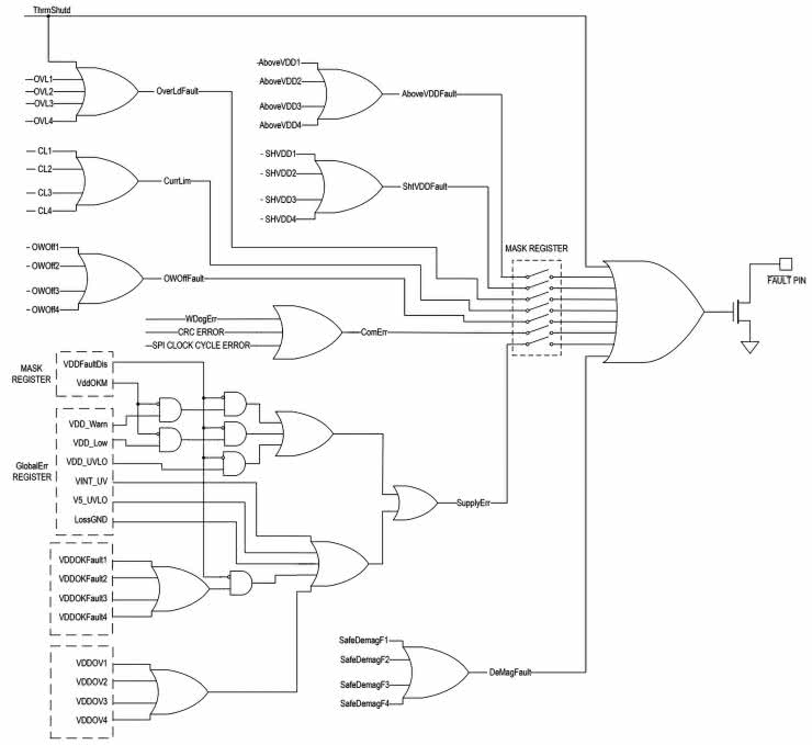 Co ciekawe, producent zdecydował się na zastosowanie sprzętowego dekodera adresów, co umożliwia pracę wielu front-endów nie tylko na wspólnej szynie SPI, ale także - i to jest zdecydowanie rzadko spotykaną cechą w przypadku tego rodzaju łącza szeregowego - ze współdzieloną linią CS! Dane przesyłane przez SPI są wyposażone w 5-bitową sumę kontrolną, zaś funkcje diagnostyczne obejmują monitorowanie napięcia zasilania, zwarcia lub przerwy w jednym z obwodów wyjściowych czy też detekcję przekroczenia bezpiecznej temperatury struktury krzemowej. O stopniu złożoności obwodów diagnostycznych najlepiej świadczy rysunek 19, przedstawiający logikę działania wyjścia FAULT oraz wszystkie obsługiwane przez nie sygnały alarmowe.