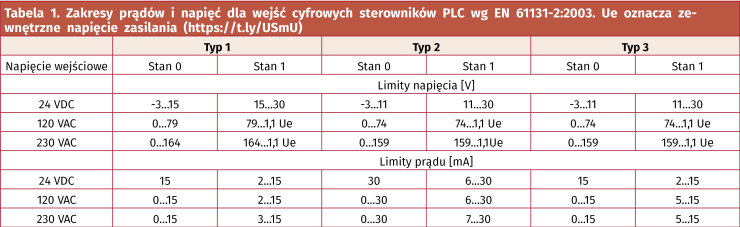 Określenie wartości progowych definiuje zatem kształt charakterystyk prądowo-napięciowych - przykładowe wykresy pokazano na rysunku 3, natomiast stosowne dane liczbowe, zaczerpnięte z normy w wersji EN 61131-2:2003 - w tabeli 1.