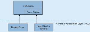 Implementacja obsługi urządzeń wejściowych jest dużo prostsza i sprowadza się, do przekazania przez sterownik urządzenia wejściowego zdarzenia do kolejki komunikatów systemu graficznego. W przypadku klawiatury, należy przekazać zdarzenie EV_KEY, w wypadku panelu dotykowego zdarzenie EV_TOUCH, a w wypadku myszki zdarzenie EV_MOUSE, wraz z odpowiednimi parametrami.