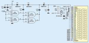Napięcie zasilające wyświetlacz (VCC) powinno mieć wartość 3,3 V i jest dołączone za pośrednictwem dodatkowego tranzystora Q2 umożliwiające programowe odłączanie zasilania wyświetlacza. Przetwornicę napięcia dla podświetlania zrealizowano za pomocą klasycznego pojemnościowego potrajacza napięcia na bramkach NAND układu 74HC7400, który jest zasilany napięciem +5 V.