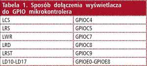Sygnał LPWM (linia GPIOC6) taktujący potrajacz jest generowany przez układ czasowo-licznikowy pracujący w trybie PWM z częstotliwością około 100 kHz. Zaletą użycia układu czasowo-licznikowego jest możliwość programowej regulacji jasności podświetlania wyświetlacza poprzez zmianę współczynnika wypełniania sygnału PWM. Nazwy sygnałów z płytki wyświetlacza oraz odpowiadające im porty GPIO mikrokontrolera, do których należy je doprowadzić wymieniono w tabeli 1.