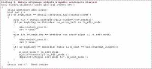 Następnie tworzone są przykładowe widgety demonstracyjne: button, choice_menu, editbox, seekbar w określonych pozycjach w oknie oraz przypisywane są im przykładowe wartości początkowe. Po zakończeniu inicjalizacji pod zdarzenie EV_KEY obiektu win jest podłączana metoda window_callback, której zadaniem jest zmiana aktywnego widgetu w wyniku wciśnięcia odpowiedniego klawisza (listing 3).