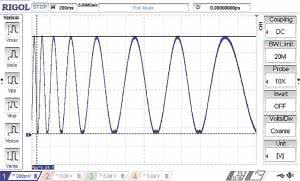 Po wgraniu programu do procesora, podłączamy sondę oscyloskopu do pinu B2, a krokodylek masy podpinamy do najbliższego punku GND. Na oscyloskopie powinna ukazać się sinusoida o amplitudzie 1 V, a obracając pokrętło enkodera powinniśmy obserwować zmianę częstotliwości sinusoidy. Na fotografii 5 pokazano działający układ podłączony do oscyloskopu, a rysunek 6 przedstawia przykładowy oscylogram zapisany podczas kręcenia pokrętłem enkodera.
