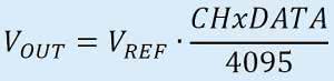 Napięcie referencyjne wyznacza napięcie maksymalne, które można uzyskać na wyjściu przetwornika. Jest ono liniowo proporcjonalne do liczby wpisanej do rejestru CHxDATA, a formalnie napięcie wyjściowe opisuje równanie: