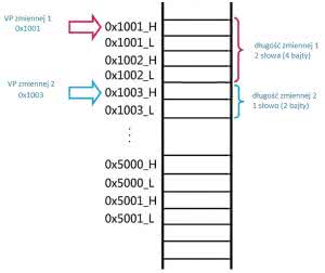 Na rysunku 8 pokazano przykład adresowania dwóch zmiennych. Pierwsza ma VP=1001 i długość 2 słów. Przy tej długości druga zmienna może zaczynać się od adresu 1003 lub większego. Przy większej liczbie zmiennych może być potrzebna dokładna mapa przestrzeni adresowej wszystkich zmiennych z adresami VP i ich długością.