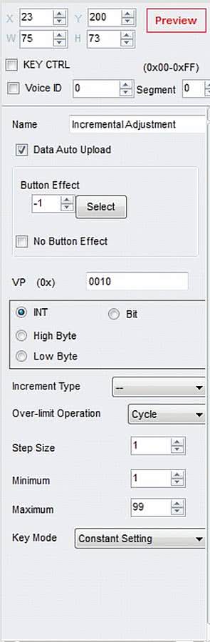 Każdej z tych ikonek trzeba przypisać możliwość wykonywania akcji w powiązaniu z panelem dotykowym. Z paska narzędzi Touch Panel wybieramy element Incremental Adjustment i zaznaczamy na obu ikonach obszar aktywny dla drivera panelu dotykowego. Najpierw klikamy na obszar ikonki "minus" i otwieramy okno Property (rysunek 9).