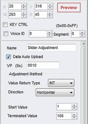 Po zdefiniowaniu ikony suwaka możemy przystąpić do wykonania slidera. W naszym przykładzie umieściłem go na ekranie drugim pod przyciskami zwiększania i zmniejszania wartości zmiennej o adresie VP=0010. Ponieważ podobny element jest zdefiniowanym widżetem w używanej przeze mnie wtyczce GDDX Microchipa, to z przyzwyczajenia narysowałem bardzo podobny element.