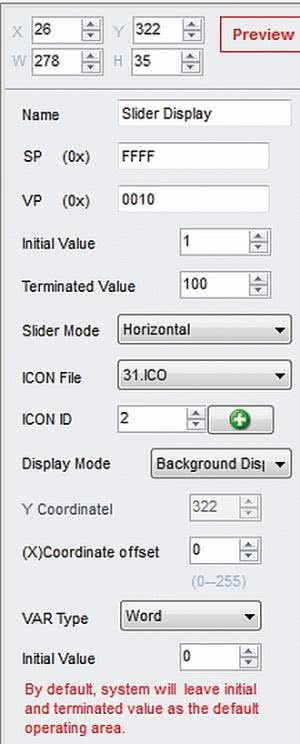 Ostatnim krokiem będzie skonfigurowanie właściwości Slider Display w oknie Property. Powiązanie za pomocą adresu VP ze zmienną pozwala na ustalenie położenia suwaka na tle rysunku slidera. Jeżeli VP Slider Display jest równe VP Slider Adjustment, to przesunięcie po ekranie dotykowym powoduje zmianę wartości zmiennej, a ta zmiana powoduje przesunięcie ikony suwaka.