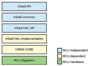 Biblioteki związane z pracą układów peryferyjnych są tak tworzone, aby użytkownik miał do dyspozycji funkcje API i nie musiał znać jak są konfigurowane i jak pracują układy peryferyjne. Tak też wykonano bibliotekę mbed library. Na rysunku 3 pokazano model warstwowy tej biblioteki. Kolorem niebieskim oznaczono warstwy niezależne od typu mikrokontrolera (producenta, rodziny), kolorem żółtym warstwy zależne od typu mikrokontrolera, a kolorem zielonym warstwę najniższą, związaną z rejestrami konfiguracyjnymi mikrokontrolera.