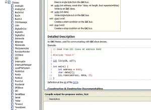 Na rysunku 4 pokazano okno IDE mbed z otwarta zakładką Classes biblioteki mbed (okno Program Workspace) i wybranym interfejsem I²C. W oknie z prawej strony wyświetla się coś w rodzaju pliku pomocy z opisem funkcji klasy i przykładami użycia.