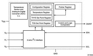 Temperatury progu Tos i histerezy Thys są programowane przez użytkownika przez zapisanie odpowiednich rejestrów. Z wyjściem OS/INT jest powiązany filtr służący do eliminowania zakłóceń. Po przekroczeniu progu jest odliczana zaprogramowana liczba cykli czasowych (od 1 do 6) i po tym czasie ponownie jest sprawdzany warunek przekroczenia progu. Jeżeli próg jest przekroczony, to zmienia się poziom na OS/INT.