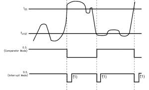 Konwersja napięcia proporcjonalnego do mierzonej temperatury jest wykonywana przez 9-bitowy przetwornik sigma-delta (rysunek 7). Wyprowadzenie OS/INT typu otwarty dren (wymaga podciągania do plusa zasilania) jest przeznaczone do sygnalizacji przekroczenia nastawionych progów temperatury. W trybie przerwania (INT) na tym wejściu pojawiają się impulsy w momencie przekroczenia progów, a w trybie termostatu na tym wyjściu zmienia się poziom w zależności od tego czy temperatura jest niższa, czy wyższa niż progowa (rysunek 8).