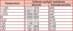 Dla temperatury ujemnej (najstarszy bit wyniku konwersji ustawiony) trzeba wykonać konwersję polegającą na zanegowaniu wszystkich bitów i dodaniu 1. Potem wyznaczenie temperatury przebiega tak, jak dla temperatury dodatniej. Na rysunku 9 pokazano zależność pomiędzy temperaturą i wartością odczytana z rejestru termometru.
