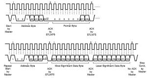 Aby przesłać dane funkcją write trzeba najpierw zapisać bufor danymi do wysłania i ustalić adres slave odbiorcy. Funkcja po wywołaniu automatycznie wyśle sekwencję START i adres slave z bitem R/W=0, następnie zadaną liczbę bajtów danych z bufora i jeżeli argument repeated jest równy 1, to zakończy sekwencję zapisu. Jeżeli repeated jest równy 0, to na końcu wysyła sekwencję STOP. Zapis rejestru konfiguracji pokazany na rysunku 11 może być wykonany przez procedurę z listingu 1.