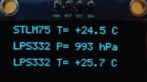 Na rysunku 22 pokazano ekran wyświetlacza OLED z wyświetlaniem: temperatury z czujnika STLM75 oraz ciśnienia i temperatury z barometru LPS331. Temperatura odczytywana z barometru jest o 1,2°C wyższa od tej odczytywanej z barometru. Najprawdopodobniej jest to wynik rozbieżności w dokładności pomiaru obu czujników.