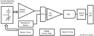 Pomiar może być wykonywany z częstotliwością z zakresu 1...12,5 Hz. Oprócz pomiaru wilgotności, czujnik mierzy temperaturę z zakresu -40...+120°C z dokładnością ±0,5°C w zakresie od +15...+40°C oraz ±1°C w zakresie 0...+60°C. Schemat blokowy układu pokazano na rysunku 23.
