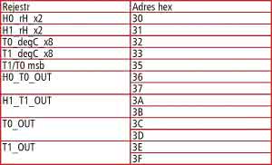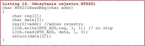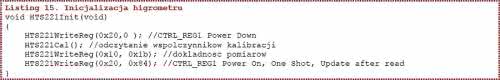 Ustawienie bitu H_DA (bit b1 STATUS_REG) oznacza, że wynik pomiaru wilgotności został zapisany do rejestrów wyjściowych HUMIDITY_OUT_L i HUMIDITY_OUT_H, a ustawienie bitu T_DA (bit b0 STATUS_REG) oznacza, że wynik pomiaru temperatury został wpisany do rejestrów. W czasie testów czujnika skonfigurowałem układ do pracy z wyzwalaniem na żądanie i z ustawionym bitem BDU. Procedurę inicjalizacyjną pokazano na listingu 15.