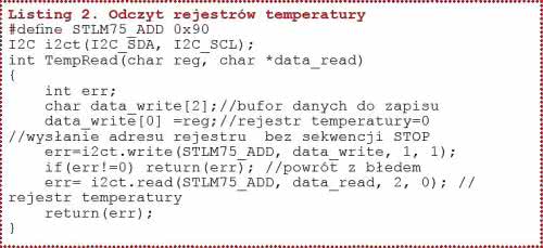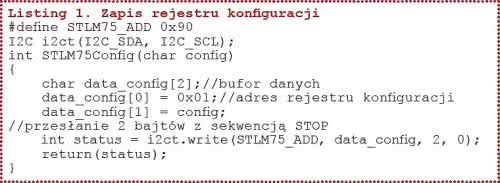Rejestr konfiguracyjny pokazano na rysunku 12. Sekwencja odczytu zawartości rejestru jest podzielona na 2 części: najpierw jest zapisywany adres odczytywanego rejestru, a następnie są odczytywane 2 bajty (rysunek 13). Na listingu 2 pokazano kompletną funkcję odczytywania rejestru temperatury. Jak już wiemy, temperatura jest zapisana na 9 bitach, a odczytane dane są zapisane na dwóch bajtach. Ułożenie 9 bitów w 16-bitowym rejestrze (dosunięte do lewej) pokazano na rysunku 14. Program, który będzie odczytywał i wyświetlał temperaturę musi: