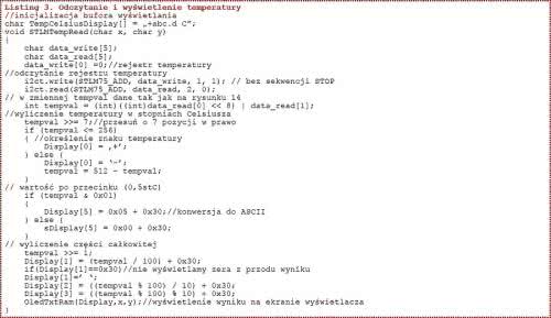Na listingu 3 pokazano funkcję służącą do odczytu i wyświetlenia temperatury na wyświetlaczu OLED, również komunikującym się z modułem Nucelo przez interfejs I²C, a na rysunku 15 wynik działania tej funkcji.