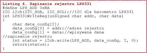 Sekwencja zapisu danej do rejestru rozpoczyna się od wysłania sekwencji START. Po niej jest wysyłany adres slave z bitem R/W=0 (0xBA). Po potwierdzeniu adresu przez LPS331 można wysyłać bajt adresu rejestru (subaddres) i bajt z zawartością zapisywanego rejestru (rysunek 17). Funkcję LPS331WriteReg (unsigned char addr, char data) służącą do zapisania pojedynczego rejestru pokazano na listingu 4.