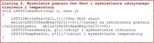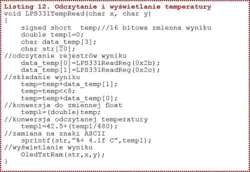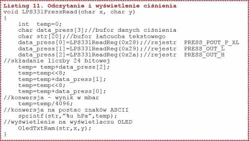Żeby otrzymać wynik w milibarach (hektopaskalach) musimy tę 24-bitową wartość podzielić przez 4096. Na listingu 11 zamieszczono procedurę odczytującą 3 bajty ciśnienia, wykonującą konwersję wyniku na milibary i wyświetlającą go na wyświetlaczu OLED. Konwersja wyniku na postać znaków ASCII jest wykonywana przez standardową funkcję kompilatora sprintf.