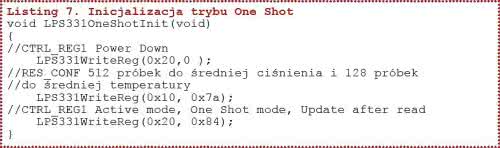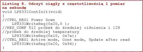 Na listingu 8 pokazano procedurę inicjalizującą ciągły tryb pracy z częstotliwością odświeżania pomiarów z częstotliwością 1 Hz. Po ustawieniu bitu BDU mamy pewność, że przy ciągłym odczycie ciśnienia i temperatury wszystkie bajty wyniku pomiaru zawierają wartości z ostatniego pomiaru. Gotowość danych do odczytu można testować odczytując rejestr statusowy STATUS_REG o adresie 0x27.