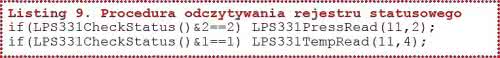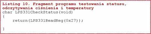 Ustawienie bitu b0 (T_DA) oznacza dostępność ostatniego pomiaru temperatury, a ustawienie bitu b1 (P_DA) oznacza dostępność ostatniego pomiaru ciśnienia. Odczytywanie statusu wykonuje procedura LPS331CheckStatus() zamieszczona na listingu 9. Na listingu 10 pokazano fragment programu testujący bity statusu i odczytujący ciśnienie i temperaturę.