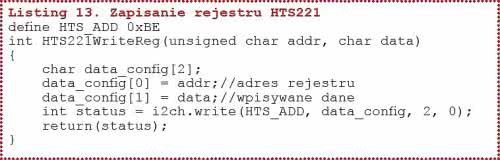 Zapisanie rejestru rozpoczyna się od wysłania przez mikrokontroler sekwencji START, a po niej adresu slave 0xBE. Potwierdzenia adresu przez HTS221 pozwala na wysłanie przez mikrokontroler adresu rejestru, a po nim zapisywanej danej (rysunek 24). Na listingu 13 zamieszczono procedurę zapisywania rejestru z dwoma argumentami: addr (adres rejestru) i data (dane do zapisania).